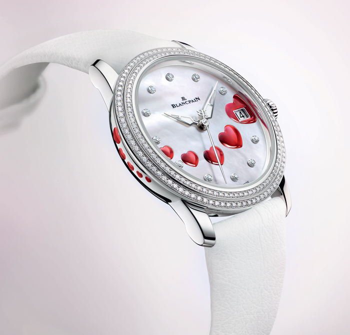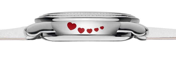 Edición especial de San Valentín, representando una ráfaga de cinco corazones , este reloj muestra en su carátula de madreperla un sutil juego de texturas y formas.