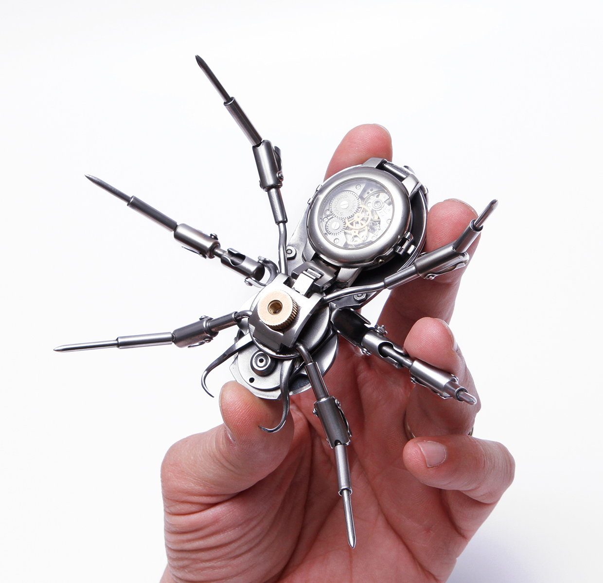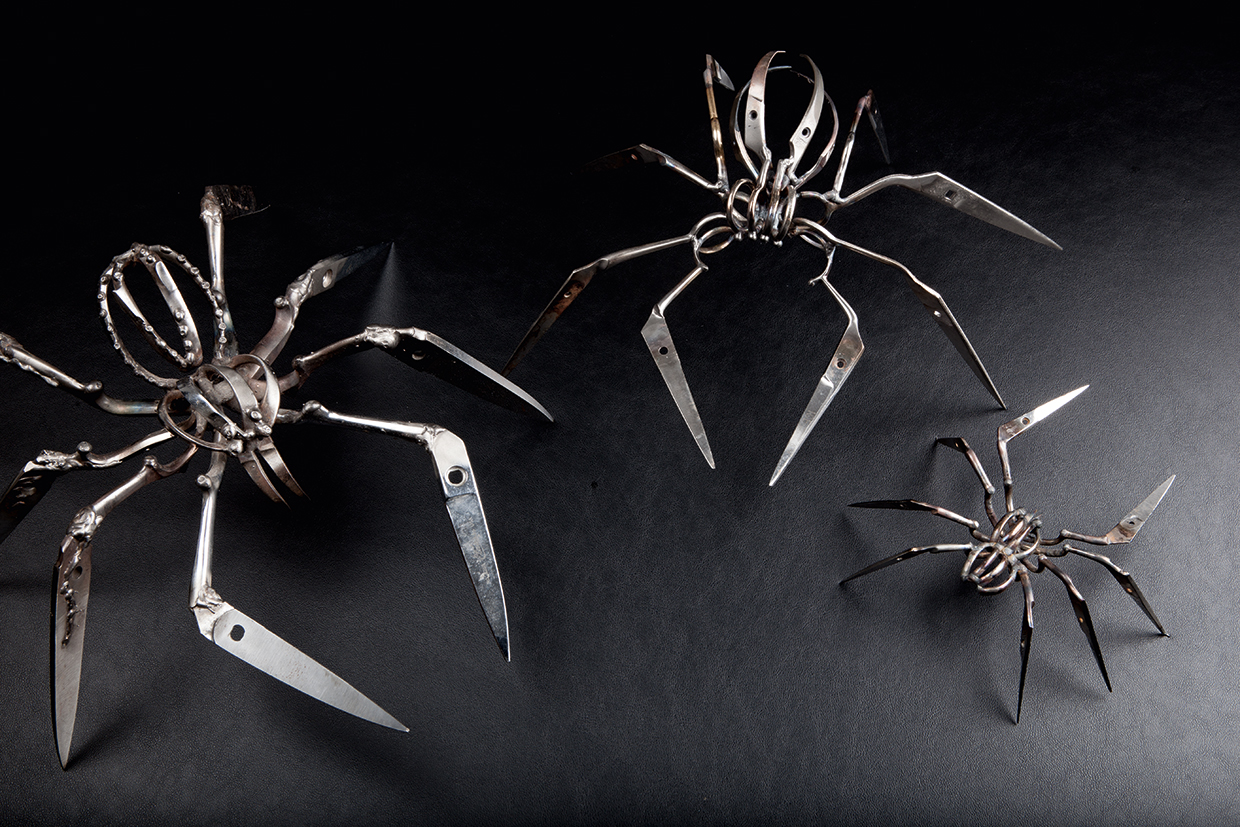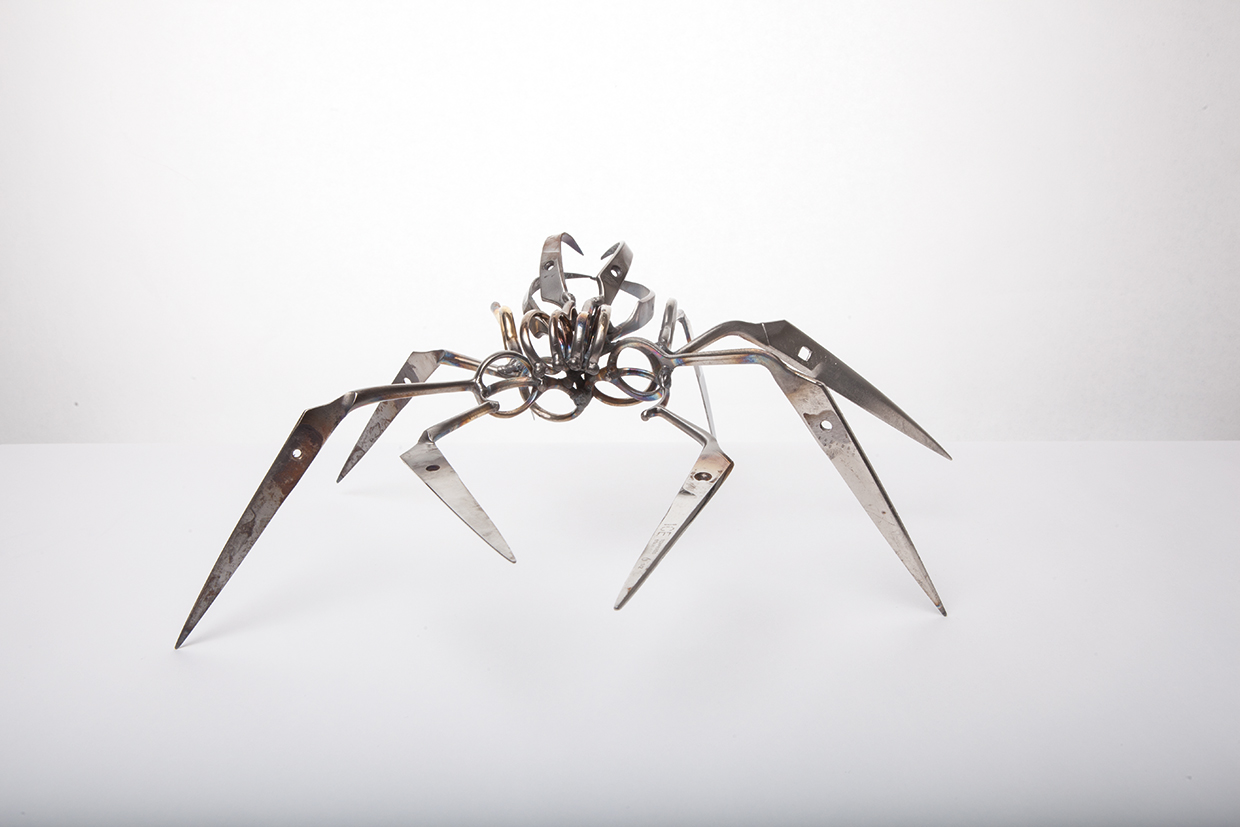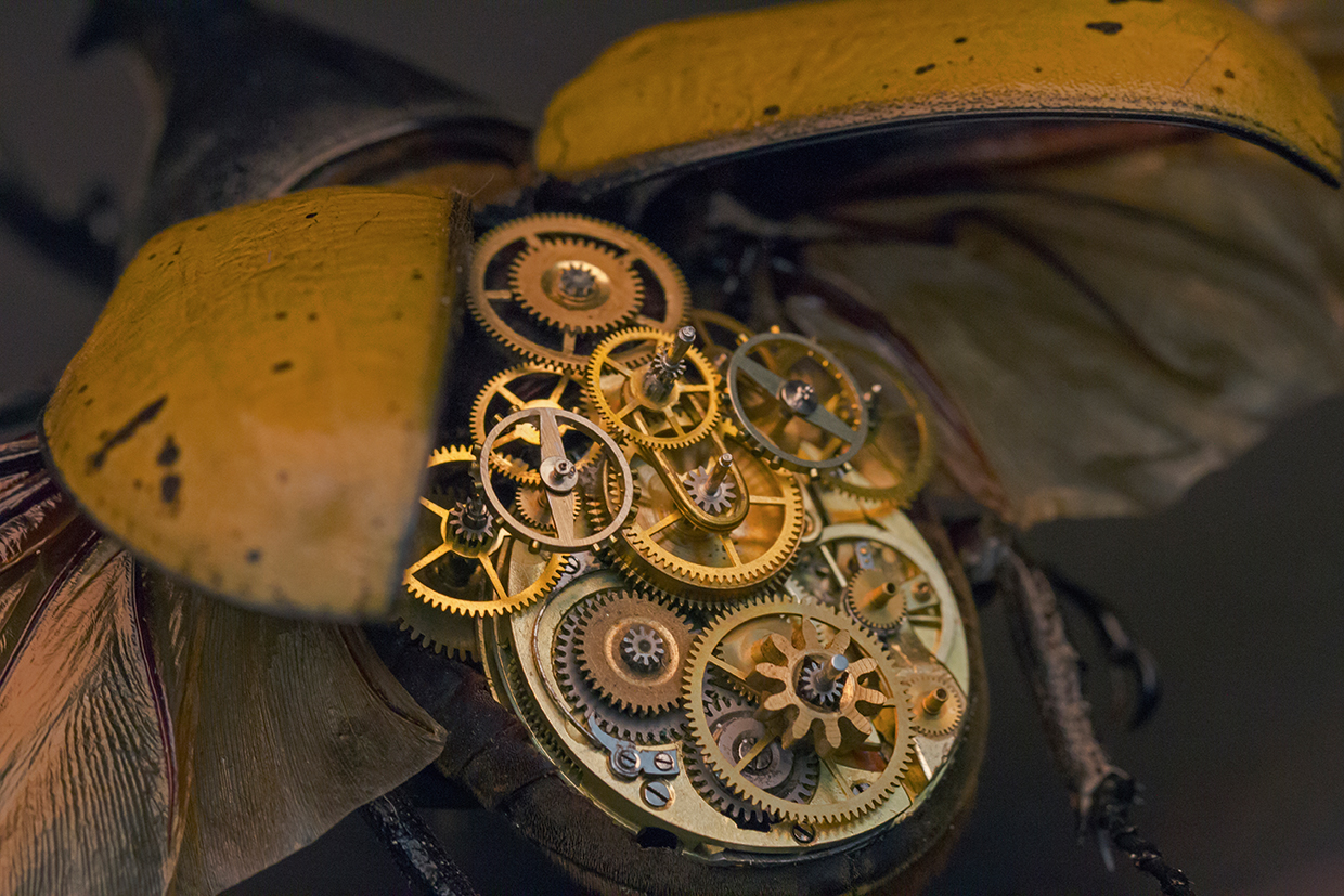 “Mechanical Entomology”, así lleva por nombre la exposición de “cuatro patas” que recibe a los artistas: Gaby Wormann con MeCre (Mechanical Creatures) quien demuestra la visión futura de los insectos gracias a mecanismos híbridos y eficientes, utilizando caparazones reales de escarabajos rinoceronte, por ejemplo; Christopher Conte, noruego de nacimiento y residente de Nueva York, es un escultor que emplea movimientos de reloj y sus conocimientos en la biomecánica, su exposición lleva por nombre Duellona y utiliza bronce blanco y amarillo para sus animales, mayormente arañas; Paul Swan Topen, un ingeniero escocés apasionado por los relojes vintage y su funcionamiento mediante mecanismos de reloj. Su exposición se titula Clockwork Butterflies, por lo que sus esculturas parecen cobrar vuelo verdadero al compás del tiempo, y por último la exhibición Scsissor Spiders de Christopher Locke, un estadounidense que utiliza como material las tijeras confiscadas en los aeropuertos para desarrollar arácnidos de filoso carácter. Y es que cada año la TSA confisca más de 8 millones de items que incluyen cuchillos, pistolas y algunos otros objetos.