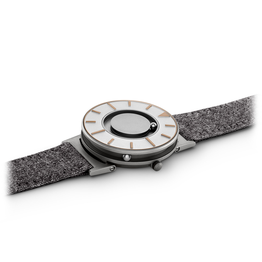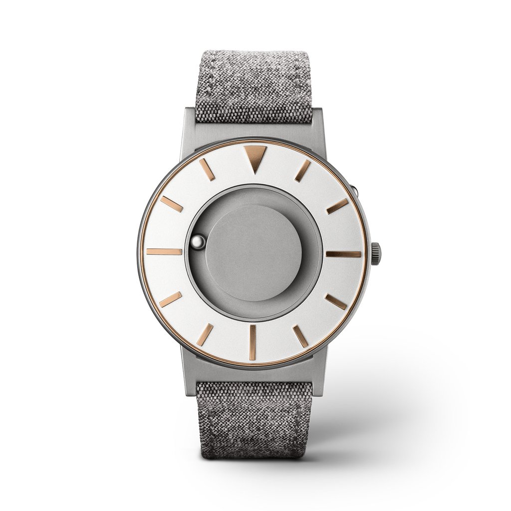Hecho de aluminio plateado, este reloj usa 24 sensores impulsados por actuadores electromagnéticos, los cuales, sin necesidad de emplear mecanismos o engranajes, transmiten la información a través de puntos de textura. Estos adoptan automáticamente la formación de números y símbolos en braille. Diseñado para que el usuario “pase las yemas de sus dedos y lea como si estuviera en una cinta móvil”, comentó en un comunicado de prensa Alex Lee, director de ventas y marketing de Dot.