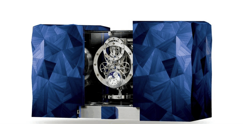 Este año la Manufactura presentó una variante más a su línea Atmos Marqueterie con el modelo Céleste, un objeto de arte de pleno derecho. Su gabinete cuenta con una abertura automática. Esta pieza excepcional, que requirió de cientos de horas de trabajo de los maestros artesanos de la marca, ha sido elaborada con más de 1,400 elementos de madera preciosa, provenientes de 35 esencias diferentes e incorpora complicaciones como la indicación de 24 horas, de los meses y de la fase de la Luna.