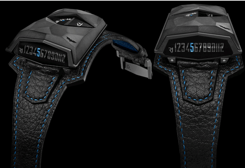 La alta tecnología que integra se rige por medio de cuatro complicaciones distintas: lateral, lineal, saltante y retrógrada. La lectura de la hora es revelada verticalmente a un costado de la caja con un indicador azul brillante, mientras que los minutos se muestran dentro de un disco giratorio negro.