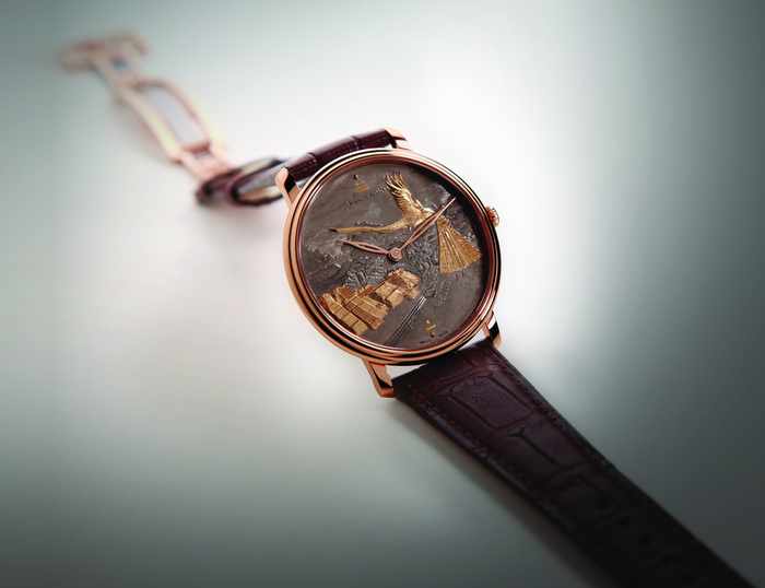 Utilizando la disciplina del damasquinado, un lienzo de titanio y oro rojo que cobra vida gracias al trabajo horológico ultra-plano del calibre 15B de cuerda manual, dotado de 117 piezas y dos manecillas esqueletadas para la indicación de las horas y los minutos.