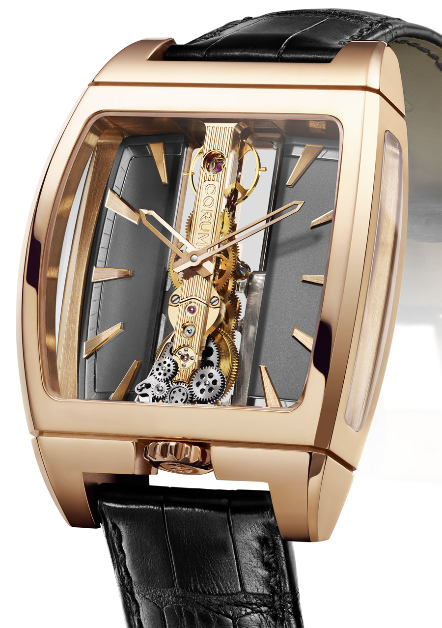 Este reloj pronto se convirtió en la insignia de las complicaciones relojeras de CORUM. Un verdadero modelo de referencia en el mundo de la alta relojería por su movimiento baguette único, situado en el centro de la caja, cuya peculiaridad es que está realizada en cristal de zafiro transparente.