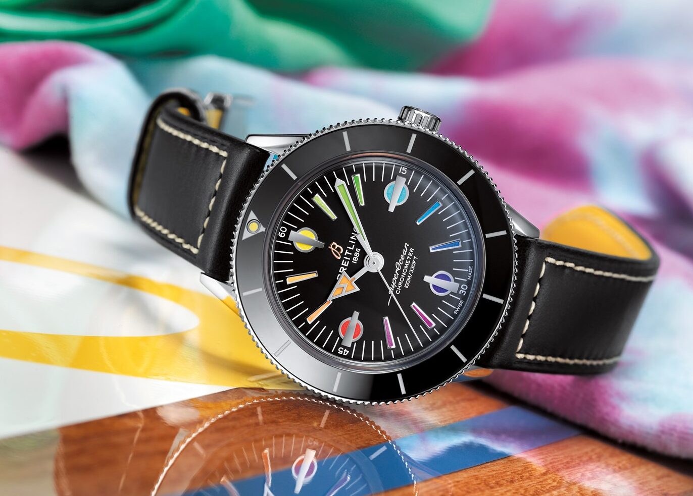 Se ofrece en caja de acero inoxidable de 42 mm y cuenta con un bisel giratorio bidireccional con aro de cerámica y carátula negra. Sin embargo, el rasgo primordial de esta pieza es el toque de color a las 12, 3, 6 y 9 horas. Todo está recubierto con Super-LumiNova en graduación de arcoíris que va del amarillo, verde, azul, índigo, violeta, rojo y naranja. Limited Edition a 250 piezas, está ofrecida en correas NATO de hilo Econyl®.