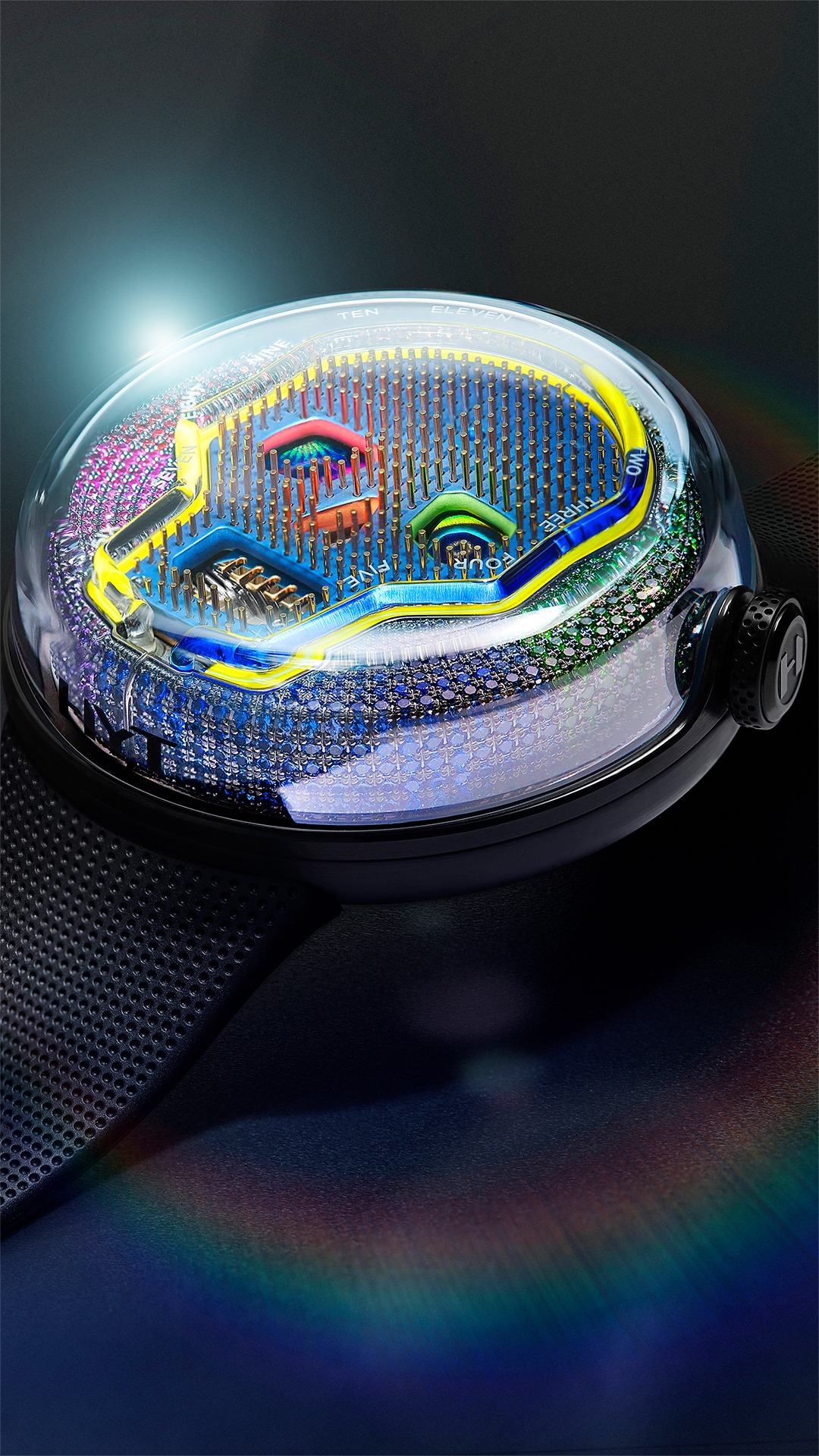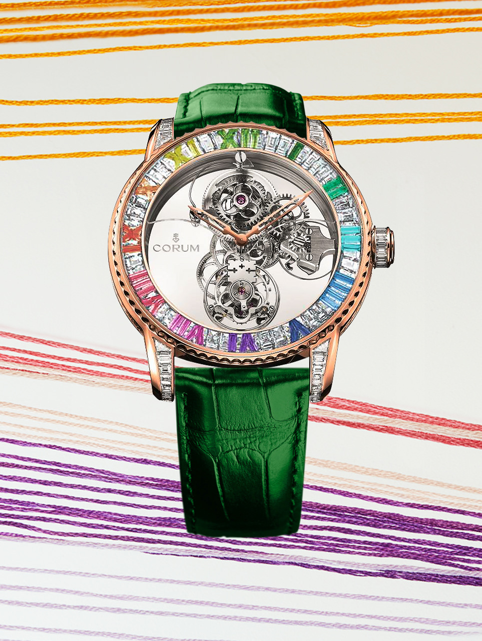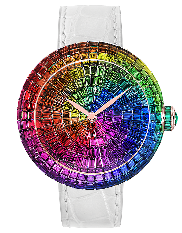 Zafiros, amatistas, tsavoritas, fueron seleccionadas para completar una paleta de colores arcoíris, con un espectro de tonalidad de 14 variaciones. Asimismo, 313 clavijas de oro amarillo fueron colocados en el dial, para formar una bellísima estructura y juego de color en la carátula tridimensional. La apertura para los ojos, boca y nariz destaca por el acabado luminiscente de diferentes colores.