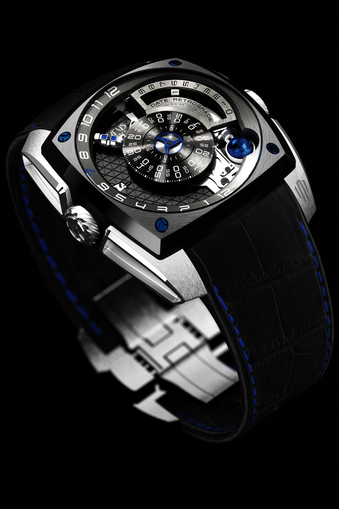 Edición limitada a 7 piezas / Movimiento automático de manufactura movimiento con una muestra única de la hora en un eje móvil, con una función de hora retrógrada, día / noche indicación, calendario grande con fecha retrógrada, Luna esférica azul con indicación de fase Lunar por el aumento gradual de un indicador blanco / Calibre: CYR598 automático, 390 componentes, frecuencia de 4 Hz, 28.800 alternancias por hora / disponible en www.cyrus-watches.ch