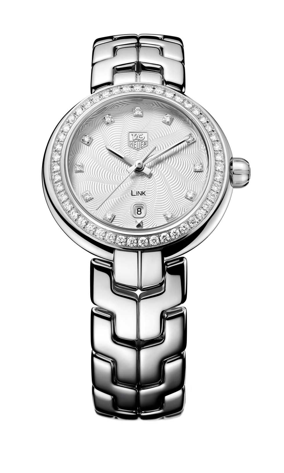 - Link Lady Full Diamonds Bezel Movimiento: cuarzo Funciones: horas, minutos y segundos; fechador a las 6 h Caja: 19 mm de acero / Cristal: zafiro Carátula: detalle guilloché; 11 índices diamantes / Bisel: engastado con 47 diamantes / Agujas: en acero tipo espada Brazalete: de acero curvado con eslabones en forma de “s” Hermeticidad: 100 metros.