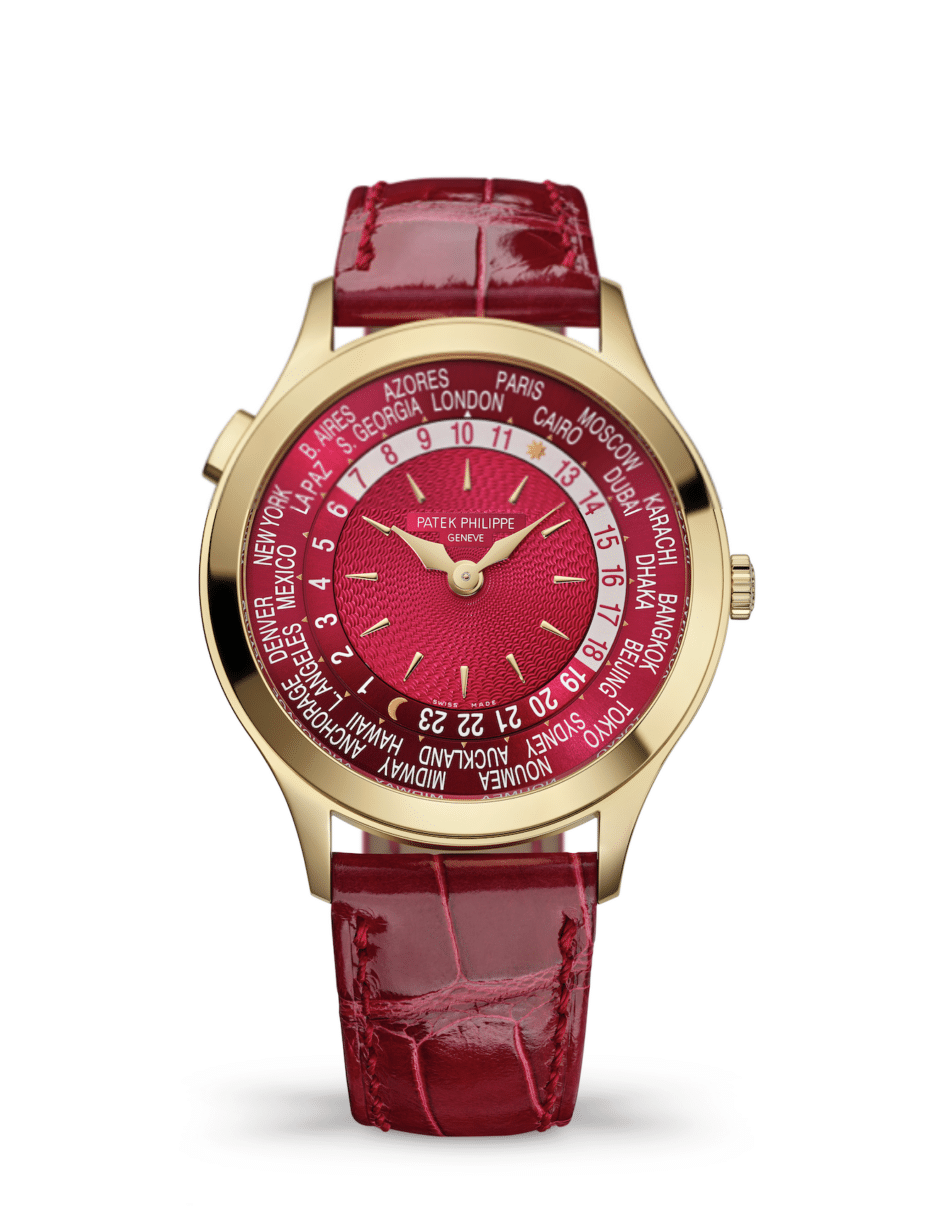 Una de las piezas históricas más reconocibles de la Gran Dama de Ginebra. Nace el World Time Reference 7129J-001, la primera versión con llamativo color rojo carmín en la carátula y caja de oro amarillo, donde también destaca un bisel libre de engaste.
