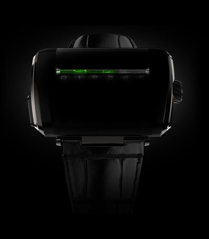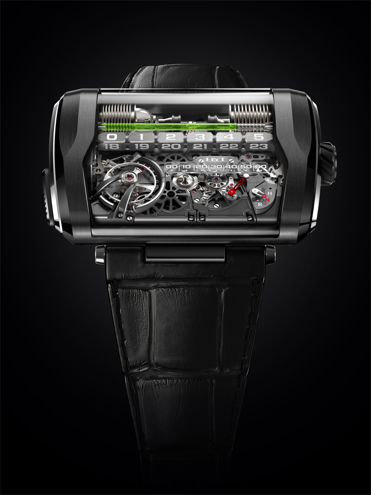 Como en todos los instrumentos de HYT, dos líquidos luchan para posibilitar la indicación del tiempo, uno teñido y el otro completamente transparente, lo que será animado por la “interfase” mecánica de presión mediante pistones, ahora bien, este tipo de solución ya es dominio de HYT, por lo que la complejidad de esta pieza fue mostrar de manera lineal el tiempo en 24 horas del día, pero ¿se imagina usted un instrumento de 248 mm de diámetro?, ¿no verdad? HYT tampoco, por lo que la solución fue fragmentar en secuencias de 6 horas un eje que rota para indicar el momento del día en el que se vive, es decir, el líquido avanza para indicar del 0 – 5 h, por lo que cuando se llega a esta medida, el líquido comienza a retroceder y simultáneamente los indicadores cambian para mostrar una regla que corre del 6 al 11, luego del 12 al 17 y, finalmente hasta el 23 para retornar al 0.