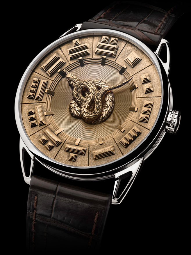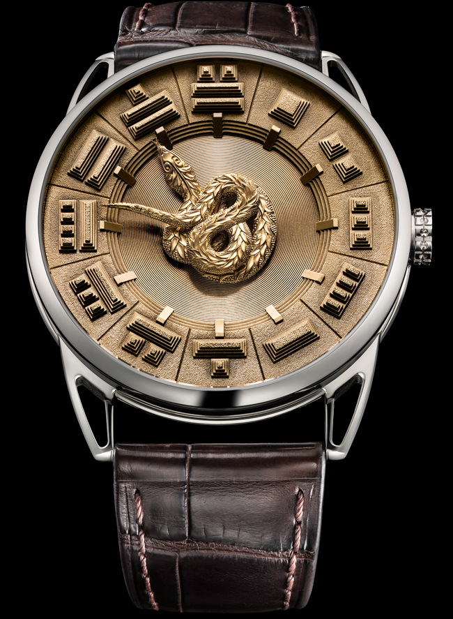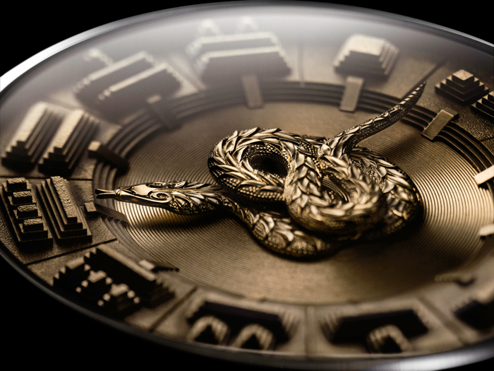 Pero no se confunda estimado lector, que si bien un dos manecillas podría no representar ningún reto técnico, sí lo hace en cuestión estética y artesanal, labrando una carátula de oro macizo gracias a los dibujos originales de David Zanetta, y al privilegiado “cincel” de Michelle Rothen. Asimismo, su mecanismo hace que la cabeza (horas) y cola (minutos) de la serpiente cobren vida y den origen a la lectura del tiempo, mientras Quetzalcóatl aparece enroscada en el centro del dial en diferentes posiciones de acuerdo a los momentos del día. Para un servidor el reto fue diseñar la totalidad de posiciones que adquiere la serpiente para continuar viéndose atractiva, mientras que las horas y minutos se sujetan al tren de engranajes en diferentes niveles, lo cual hará que ninguna roce a la otra.