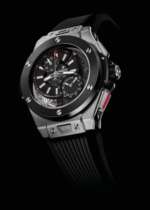 Con la celebración de los 10 años del Big Bang, HUBLOT apuntala su colección con un mecanismo de alarma, logrando la meta trazada en cuanto al dominio de complicaciones y materiales en función y fusión a un reloj. Este tipo de complejidad mecánica pertenece a las de sonería, por lo que el movimiento que le anima es un HUB 5003 de carga manual con función GMT y alarma que suena tras golpear el martillo contra un timbre (gong), y que se alcanza a registrar y controlar mediante una indicación ON/OFF del armado o no de la alarma. Asimismo la pieza cuenta con una autonomía impresionante de hasta 72 horas de reserva de marca. Las dos referencias exhibidas están construidas en caja de titanio o King Gold y limitadas a 250 ejemplares mundiales.