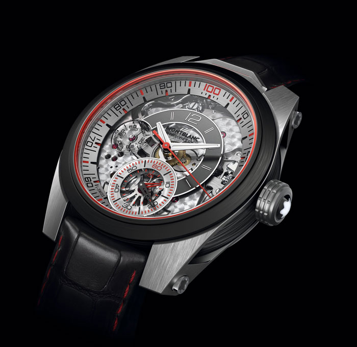 Ahora sí llegamos al plato fuerte: Montblanc TimeWalker Chronograph 100, principio que toma vida del poderoso statemente del TimeWriter II de hace un par de años. La carátula es el zafiro de su protección, para ver el movimiento y las indicaciones: dos barriletes y dos volantes (bi-fréquence) para completar el módulo del reloj y del cronógrafo se incorporan al movimiento MB M66.25, construido con la última tecnología utilizada para la industria del automóvil deportivo, que además logra que la rueda de balance –del crono– vibre a 50 Hz, es decir: ¡¡¡360,000 semi-oscilaciones por hora!!! (Leyó usted bien, pero limitado a 50 piezas).