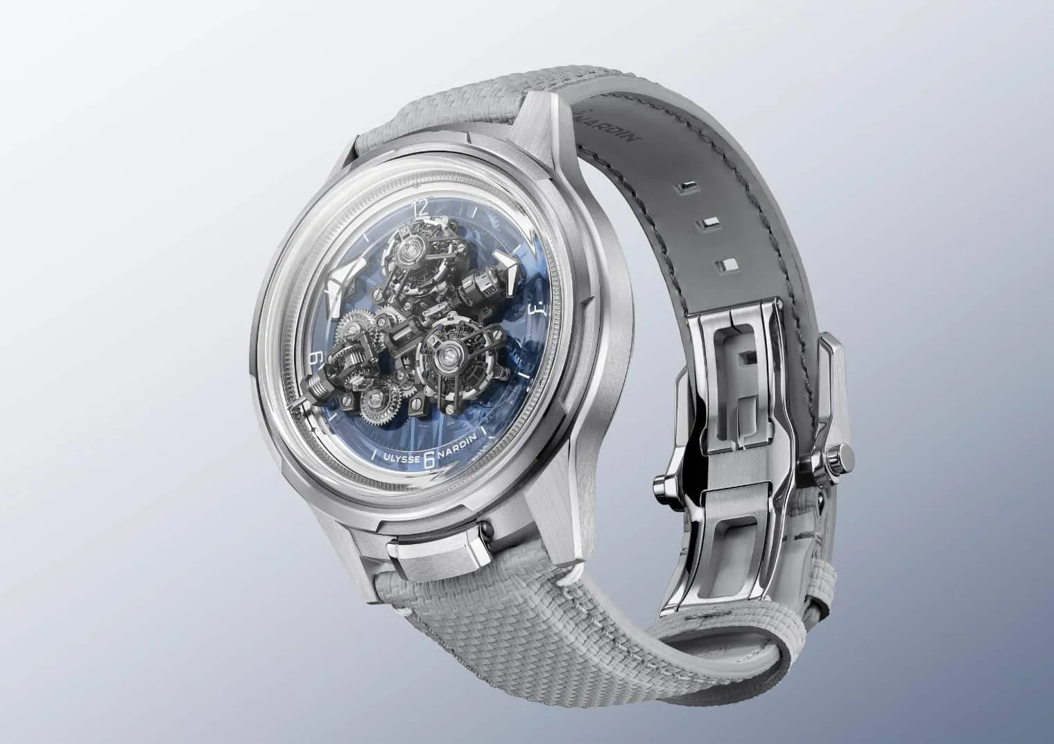 Toda esta maravilla está alojada en una caja de oro blanco de 44 mm que destaca por una construcción en siete planos y cuyo disco horario, que gira una vez cada 12 horas para indicar las horas, se presenta en azul transparente fabricado en Nanosital (un material policristalino ópticamente transparente creado mediante la cristalización controlada del vidrio), lo cual permite apreciar el mecanismo automático subyacente.