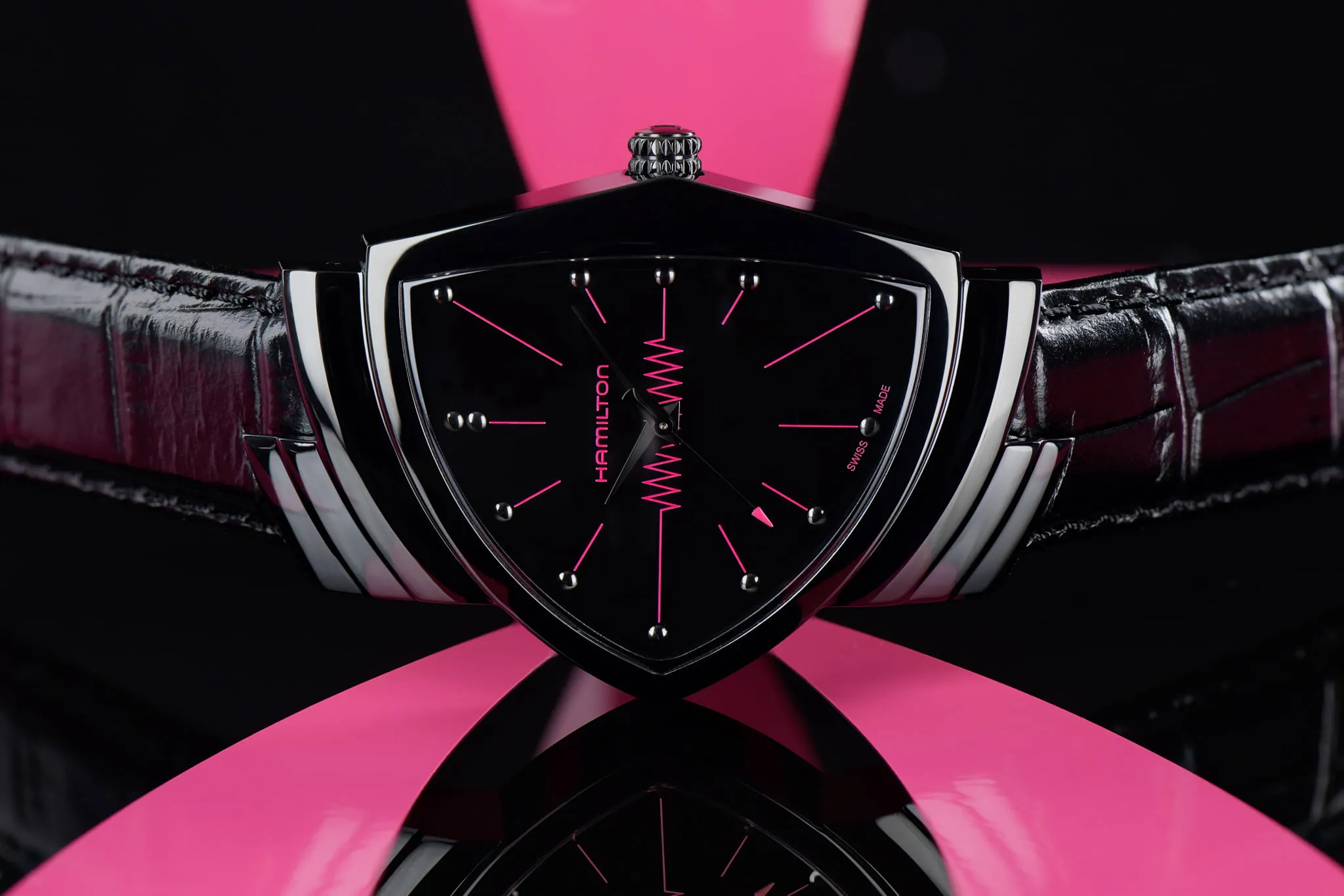 - Carátula: negra con vivos en color rosa para índices y motivo Ventura original de 1957; agujas negras tipo Dauphine ennegrecidas para horas y minutos, segundero de acero ennegrecido con punta de flecha destacada en color rosa