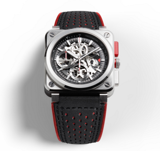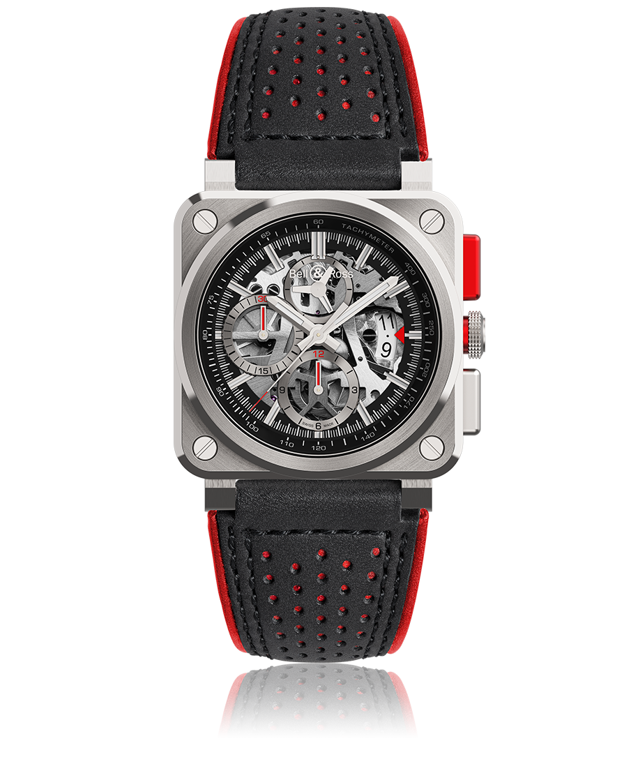 La pieza desafía la lógica de la precisión y el diseño gracias a un atrevido look supersónico que está propulsado por un mecanismo de cronógrafo de remonte automático. Así, horas, minutos, segundos (12 h), gran fecha y crono con toalizadores a las 6 y a las 9 horas, estarán siempre a demanda con un vistazo a la muñeca. Construida en una caja de acero satinado y pulido que se extiende hasta los 42 mm de diámetro, la referencia luce una carátula esqueletada presenta índices aplicados y tratamiento luminiscente para las agujas de las horas y minutos. Finalmente se abraza a la muñeca mediante una correa de cuero y material sintético con pespuntes en rojo, y es hermética hasta los 100 metros de profundidad.