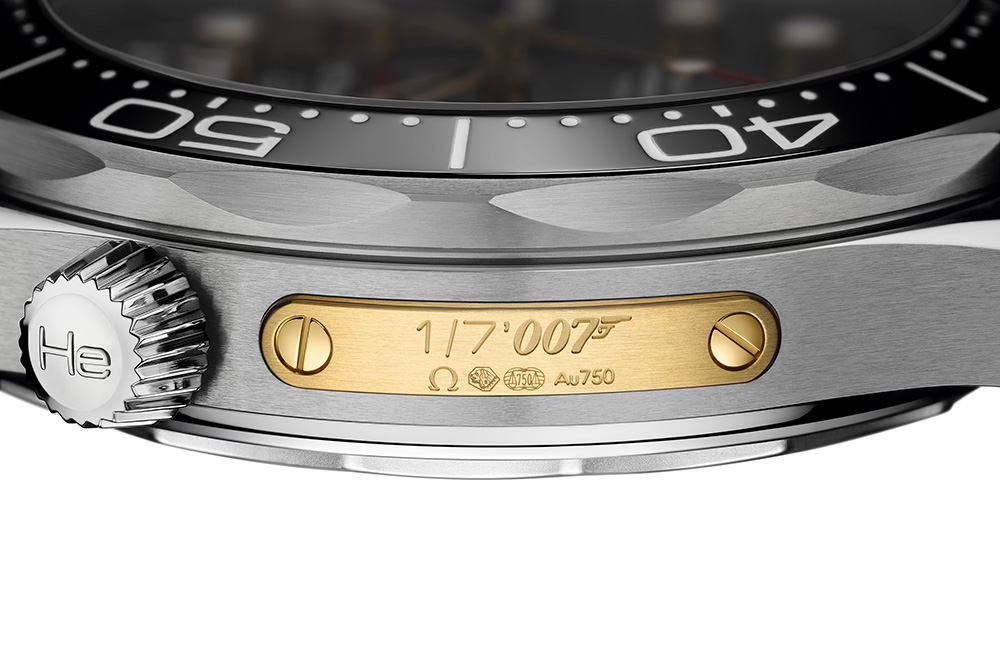 Es evidente que, al tratarse de una celebración al Agente 007, ofrece rasgos distintivos. Por ello cuenta con una carátula grabada con patrón de cañón en espiral y un cabezal de cartucho 9 mm en el centro. En los laterales, Omega ha decidido colocar una placa de oro de 18 quilates con el número correspondiente a la limitación.