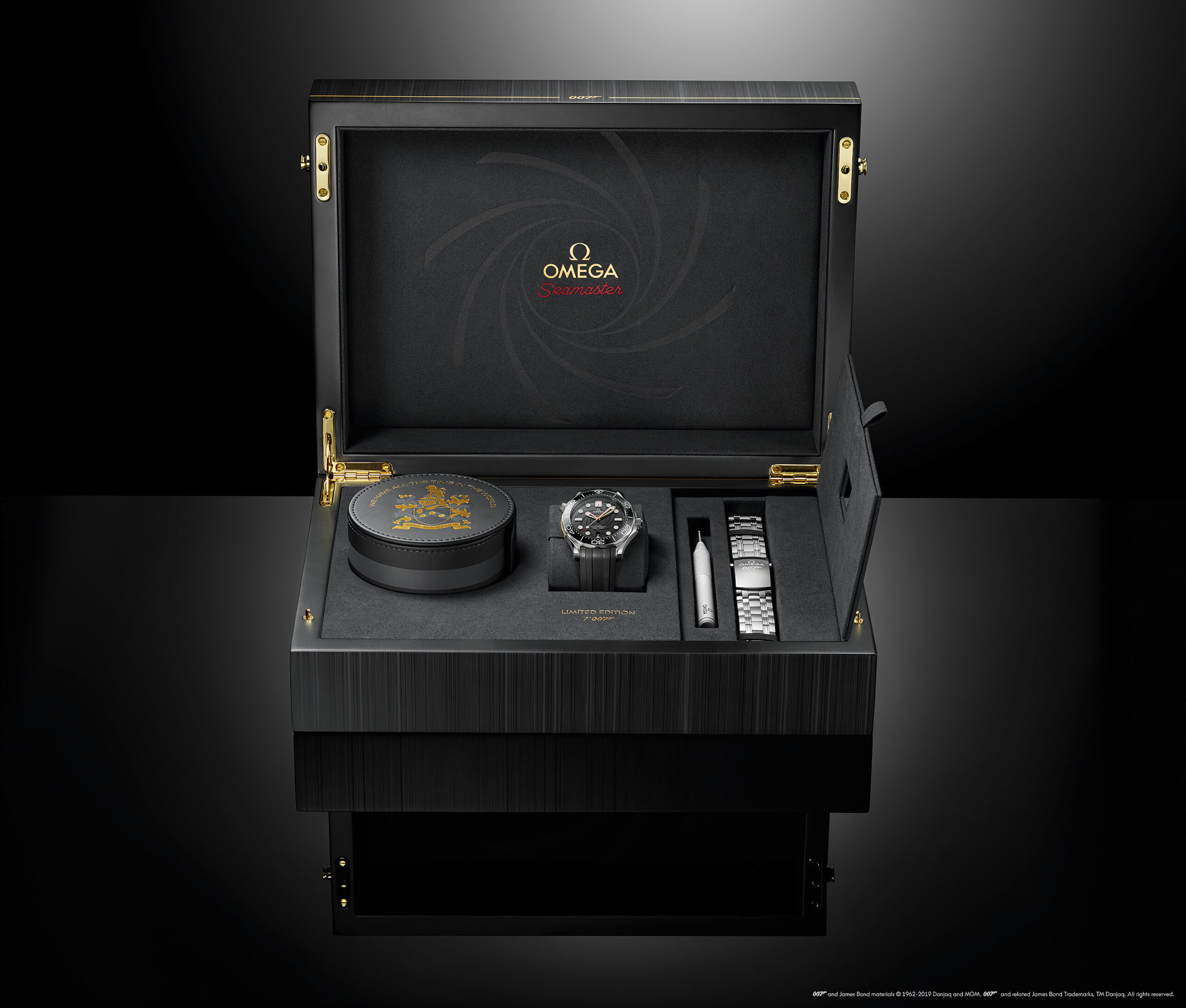 Se lanza en un estuche negro con patrones de cañón y botones de cabeza de bala. Además, se abraza al pulso mediante una correa de caucho color negro. Cuenta con la certificación Master Chronometer por el METAS y recupera la historia de la marca desde que se asociara con la franquicia en 1995. Por ello Omega es el reloj de James Bond.