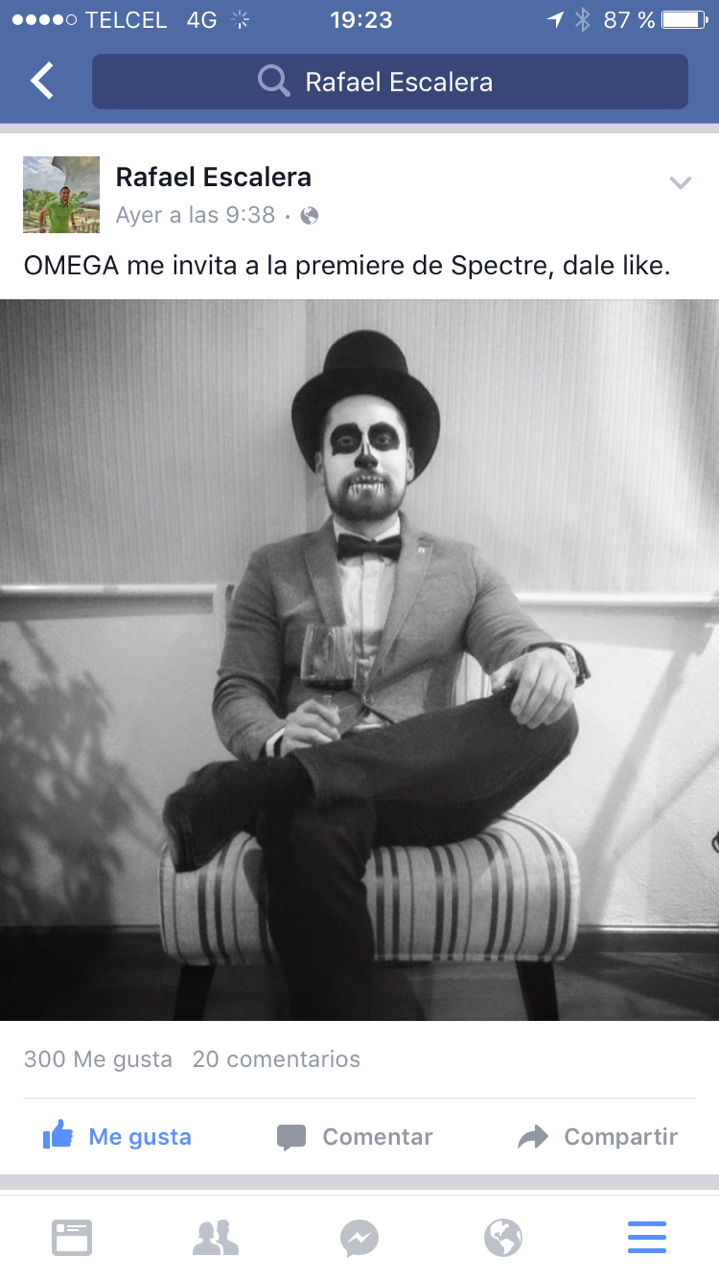 Toda la información y capturas de pantalla deberán ser enviadas a: [email protected] antes de las 21:00 h del sábado 31 de octubre de 2015, hora del Centro de México. Para poder participar, deberás tener cuenta oficial de Facebook, ser seguidor de nuestra cuenta oficial (Watches World), subir una fotografía personal en donde te hayas disfrazado para celebrar el día de muertos (disfraz muy mexicano: calavera, la muerte, diablo, la llorona, etc). No olvides mencionar “OMEGA me invita a la premiere de Spectre, dale like” / El ganador será quien logre acumular más likes en su foto de cuenta personal de Facebook. Para probar tu gran alcance, te pedimos que envíes una captura de pantalla y la liga de Facebook que envíe a la misma antes de la fecha citada.