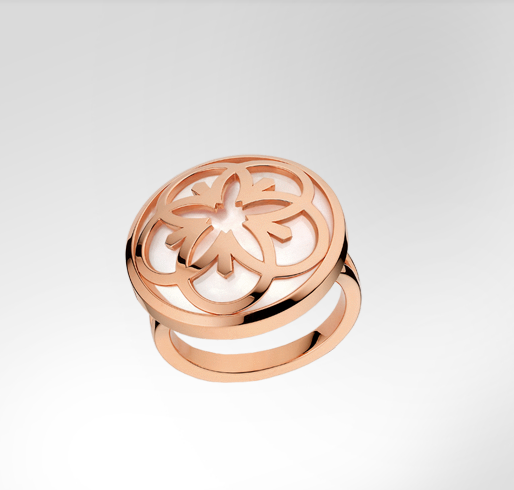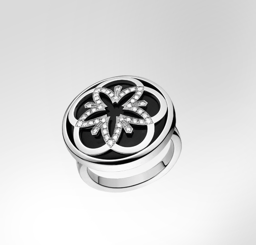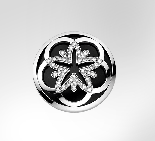 Más grande y vistosa, esta colección también hace referencia al logotipo de Omega, que al unirse forma los pétalos de una flor. Disponible en oro rojo y madre perla y oro blanco con ónix. Igualmente ligada a la colección de relojes De Ville.