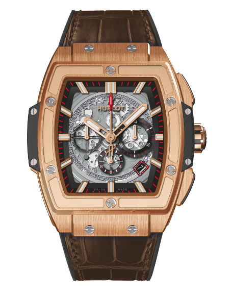Totalmente “hublotizado” como puede apreciarse en su arquitectura y sus acabados, este movimiento automático esqueleto con una reserva de marcha de 50 horas puede admirarse a través de la carátula de zafiro que revela toda la belleza del mecanismo esqueletizado, incluido su disco del calendario.