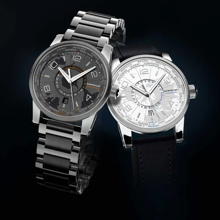 - Los relojes que muestran simultáneamente el tiempo en más de una zona han cobrado una especial importancia para los relojeros. Algunos relojes pertenecen a un género en el cual Montblanc ha logrado realizar varias hazañas. Los llamados “relojes de zona horaria” han satisfecho los muy diversos requerimientos de los trotamundos y viajeros frecuentes. Entre esas funciones están el poder mostrar de forma simultánea la hora tanto la local como la hora de origen del usuario, o la función del UTC (Tiempo Universal Coordinado +/- zona horaria), pero también tienen la habilidad de mostrar todas las 24 zonas horarias del mundo con un simple vistazo, incluyendo la indicación día/noche para la hora de origen, así como mostrar la fecha, facilitando con rápidos y fáciles cambios el paso de una zona a otra, etc.